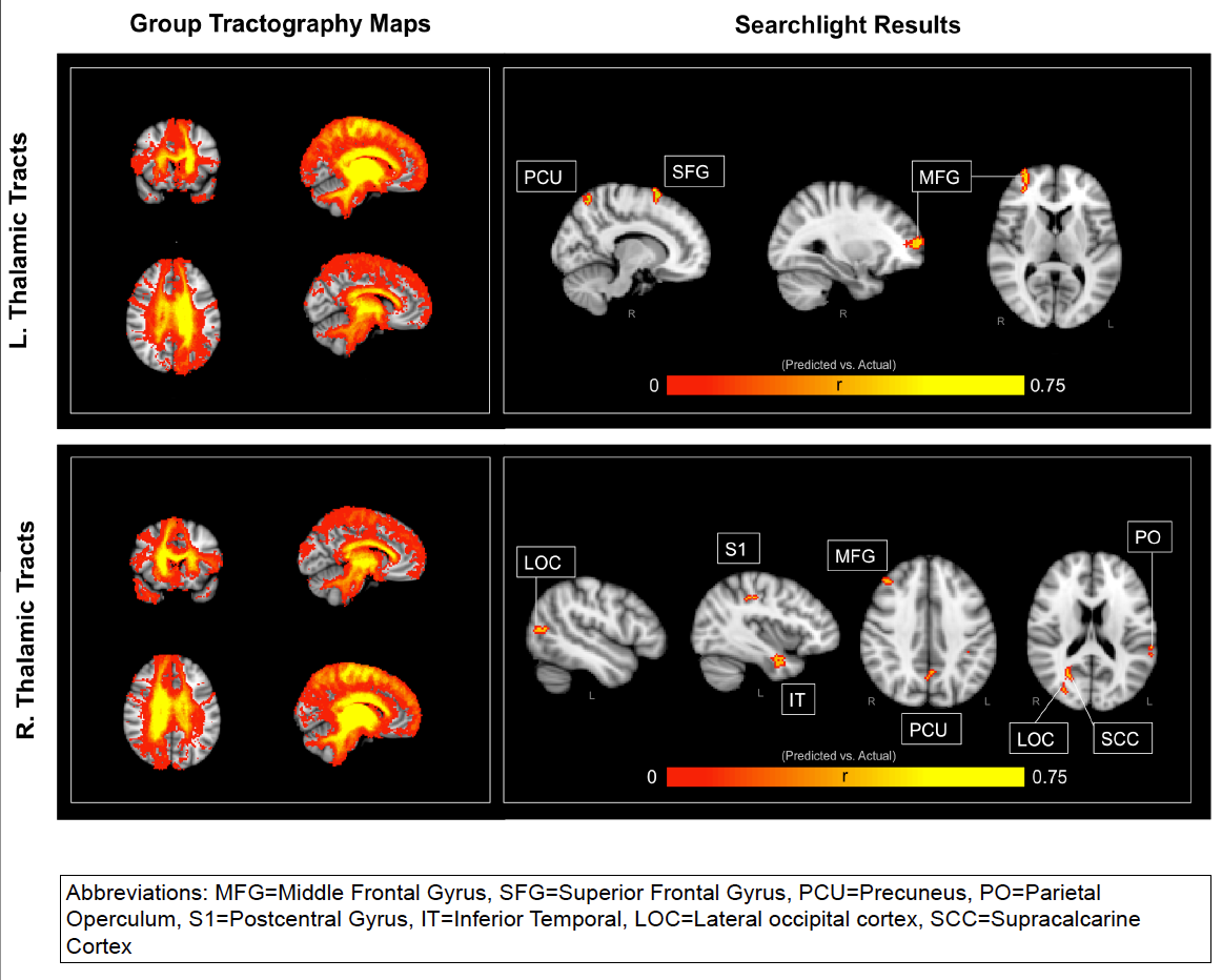 Brief: In this study we used probabilist tractography on diffusion tensor imaging data to look at the whole brain’s anatomical connectivity index with the Left and Right Thalamus for patients with varying disorders of consciousness. Using a searchlight mapping procedure, we trained a Support Vector Regression on all but one patient and attempted to predict a left out subject’s “Coma Recovery Scale” value (leave-one-patient-out cross-validation). That is, we looked at each region in the brain and asked the question “Does this region’s connectivity with the thalamus provide us with significant predictive power in regards to a DOC patient’s level of awareness?”. We were able to capture a significant portion of the variance (upwards of 56% of the variance), especially when drawing features for the SVR from regions such as the Middle Frontal Gyrus, Superior Frontal Gyrus, Precuneus, Parietal Operculum, Postcentral Gyrus, Inferior Temporal, Lateral Ocipital cortex, and Supracalcarine Cortex. Of particular intrigue is the contra-lateral importance of these connections. Thus, the ability for the Thalamus to anatomically connect with these regions significantly predicts levels of consciousness.